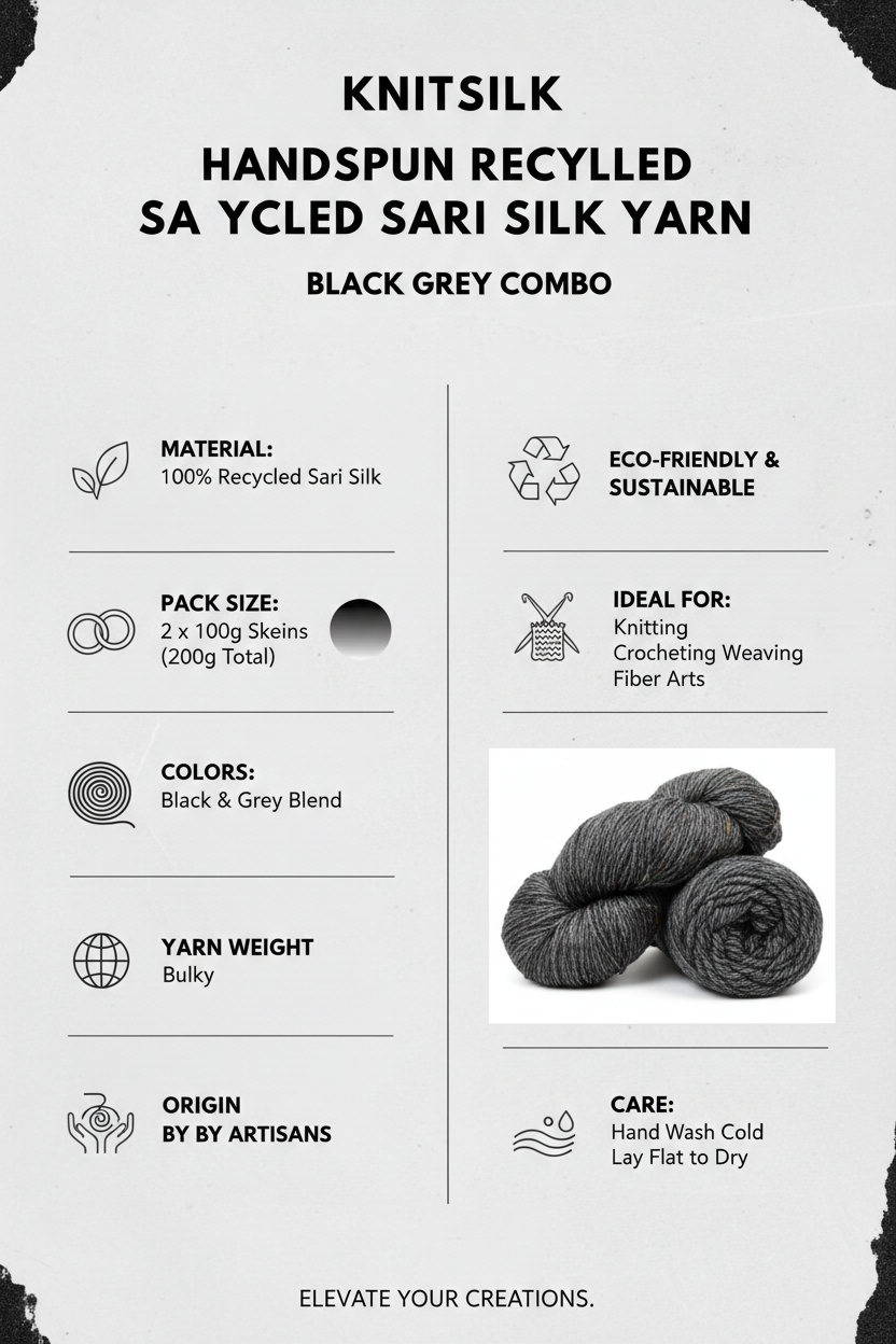 Knitsilk Handspun Recycled Sari Silk Yarn – Black & Grey Combo | 2 x 100g Skeins | Eco-Friendly Bulky Yarn for Knitting, Crocheting & Weaving