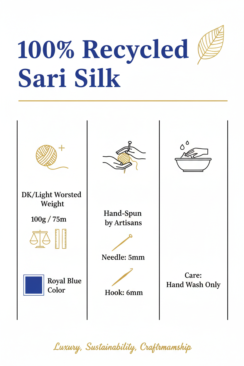 Crafted from 100% recycled sari silk, this luxurious yarn offers a rich texture and soft, silky feel that elevates any handmade project. Each skein is hand-spun by artisans using reclaimed sari fabric remnants, making it a sustainable and eco-conscious choice for knitters and crocheters.Perfect for accessories, lightweight garments, or statement pieces, this yarn drapes beautifully and adds a unique touch to your projects